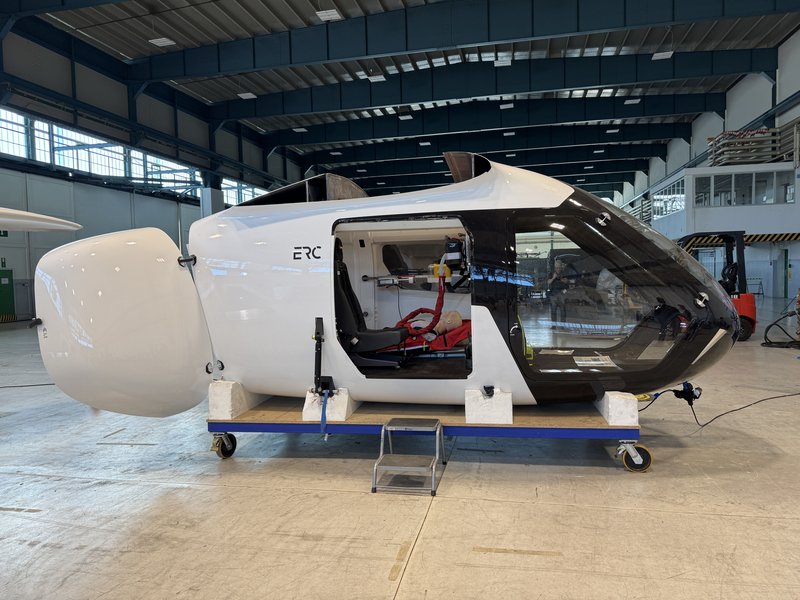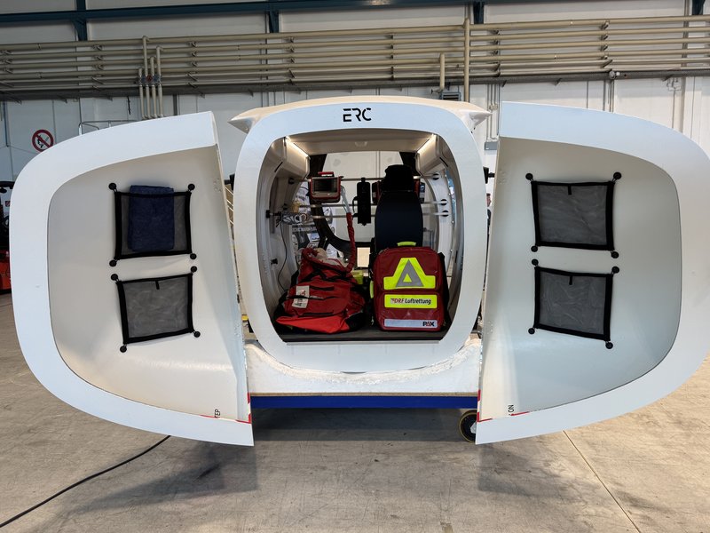 Begleitend zum Prototypen des so genannten eVTOLs (electric Vertical Take-Off and Landing) präsentierte das entwickelnde Unternehmen eRC-System GmbH (Ottobrunn) eine Modellkabine mit medizinischer Ausrüstung, die eine Vorstellung der zukünftigen Transportsituation vermittelt. Beispielsweise wird ein Patient mit zeitkritischer Diagnose liegend in ein hierfür spezialisiertes Krankenhaus verlegt werden können, begleitet durch medizinisches oder pflegerisches Personal. „Das elektrische Flugsystem eröffnet völlig neue Perspektiven, um das bestehende Rettungsnetz effizient zu ergänzen“, erklärte Oberbürgermeister Jan Rothenbacher. Landrat Alex Eder betonte: „Das „System eResCopter“ ist eine enorme Chance gerade für den ländlichen Raum und kann zur Sicherung unserer Krankenhausstandorte beitragen.“