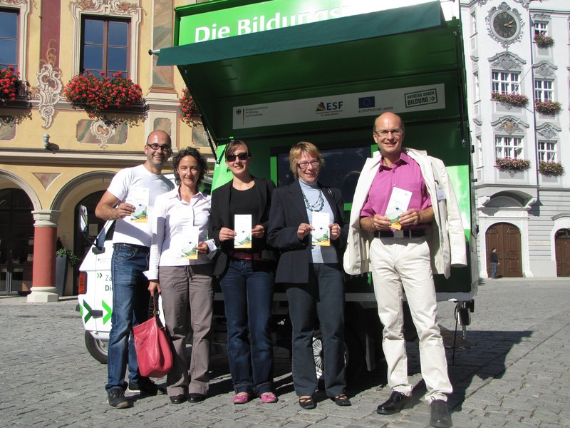 Bei seiner Tour durch Deutschland hat das Infomobil zur Bildungsprämie in Memmingen Station gemacht. Volkshochschulleiter Michael Trieb (rechts), Anette Ohrtmann-Oerthel, Leiterin des IHK Bildungshauses Schwaben (2.v.l.), Beate Maier-Graf, Leiterin des Kolping-Bildungszentrums Memmingen (2.v.r.) und Wirtschaftsförderin Barbara Platschka (Mitte) warben gemeinsam mit dem mitgereisten Projektteam (hier Robert Manu, links) für die Bildungsprämie. Mit dieser kann berufliche Weiterbildung mit bis 500 Euro jährlich gefördert werden.