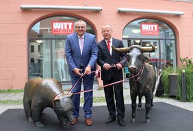 Ab sofort sind „Bulle und Bär“ wieder bespielbar. Oberbürgermeister Manfred Schilder und Thomas Munding, Vorstandsvorsitzender der Sparkasse Memmingen-Lindau-Mindelheim, weihten die beiden Bronze-Statuen auf ihrem neuen Bodenbelag ein.