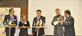 Hans-Joachim Fuchtel, Parlamentarischer Staatssekretär im Bundesministerium für wirtschaftliche Zusammenarbeit und Entwicklung lobte die Bildungspartnerschaft Memmingen – Tschernihiw als leuchtendes „best-practice“-Beispiel für eine gelungene Zusammenarbeit zwischen Städten in Deutschland und der Ukraine. Gemeinsam mit dem ukrainischen Generalkonsul, Vadym Kostiuk, begrüßte Fuchtel rund 170 Teilnehmerinnen und Teilnehmer aus insgesamt 66 Kommunen der ersten Deutsch-Ukrainischen Partnerschaftskonferenz in Nürnberg.