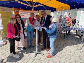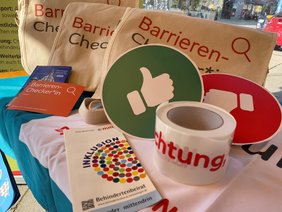 Während die „Barriere-Checker*innen“ unterwegs waren, gab es für die Passanten am Informationsstand des Behindertenbeirates einiges zu entdecken. Schüler des bfz stellten ihre Partnerschule für Kinder mit geistiger Behinderung in Afrika vor und die Freiwilligenagentur Schaffenslust informierte über ihr neues Projekt „Engagement für alle“ – ein Projekt für mehr Inklusion im Ehrenamt.
