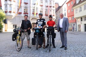 Mit dem Rad ist Wolfgang Mühlbauer schon viel unterwegs gewesen, auch als er noch in Memmingen gewohnt hat, erzählt der 63-Jährige. Selbst über die Alpen ist er seit den 1990er-Jahren regelmäßig mit dem Rad gefahren. Für das Jubiläum der 25. Alpenüberquerung hat er sich jedoch etwas Besonderes ausgedacht. Er wird diesmal Spenden für die Sternstunden des BR sammeln, auch die Stadt Memmingen unterstützt ihn hierbei. In seiner Geburtsstadt, wo Wolfgang Mühlbauer einen Tag Pause eingelegt hat, überreichte Oberbürgermeister Manfred Schilder dem Radler-Trio vor der Weiterfahrt noch Geschenke und wünschte eine gesunde Ankunft in Italien. Ziel der Fahrt ist die Wallfahrtskapelle der Madonna del Ghisallo, der Schutzheiligen der Radfahrer, hoch über dem Comer See gelegen.