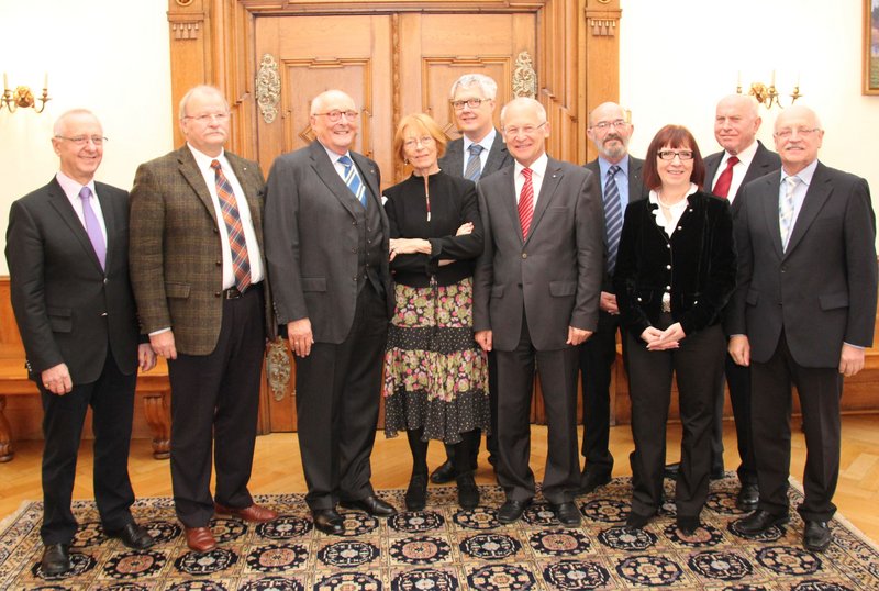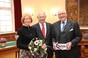 Dass er in seinem Leben nochmals im Sitzungssaal des Rathauses sprechen würde, damit hat der ehemalige Oberbürgermeister Dr. Johannes Bauer nicht gerechnet. Schließlich habe er im letzten Jahrhundert hier ein Amt inne gehabt, betonte er bei einem Empfang, den die Stadt und sein Amtsnachfolger Dr. Ivo Holzinger anlässlich seines 75. Geburtstages ausrichtete. Die Bürgermeister und Vertreter der Stadtratsfraktionen hatten sich ebenso der ehemalige Stadtkämmerer Rudolf Jurczok im Sitzungssaal des Rathauses eingefunden, um einem Mann zu gratulieren, der, wie es der Oberbürgermeister ausdrückte, „wichtige Weichenstellungen“ vorgenommen hatte. Bauer, der von seiner Ehefrau Julia Barbara begleitet wurde, war zwei Amtsperioden von 1968 bis 1980 Oberbürgermeister in Memmingen.