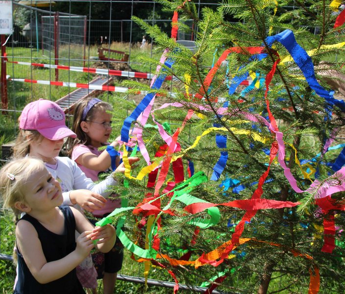 „Da oben fehlt noch was. Der wird ja recht bunt. Das wird ja schön“. Die drei Mädchen Annabel, Vanessa und Doruntina hatten die wichtigste Aufgabe des Tages: Sie durften das Richtbäumchen für die Hebauf-Feier schmücken bevor es auf dem Dach der neuen Kinderkrippe aufgestellt wurde.