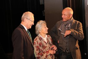Es ist kurz vor zwölf, als der Oberbürgermeister ihr die Eingangstüre aufhält. Rosa Geiger, 100-jährige Memmingerin und dabei noch in bester Konstitution, tritt ein. Walter Weyers, Intendant des Landestheaters, begrüßt die rüstige Dame und führt sie sogleich in den Theatersaal. Dort laufen Proben für das Stück Zwillingsbrut, das demnächst Premiere feiert. Eingerahmt von Weyers und Holzinger lauscht sie aus der dritten Reihe den Proben. „Ich steh eher auf Klassiker“, bemerkt sie nach ein paar Sequenzen. Doch auch hier ist Intendant Weyers nicht um eine Antwort verlegen: demnächst feiere Schillers Maria Stuart Premiere und lädt die alte Dame dazu ein. Den Theatersaal kenne sie noch von früher, berichtet sie. Denn früher sei sie oft im Theater gewesen. „Die Kunst hat mich immer interessiert“, erzählt sie auf ganz liebenswürdige Art. Auch auf der Bühne des Großen Saals stand sie schon einmal. Mit dem Schultheater habe sie einst auf den Brettern gespielt, erinnert sich Geiger. „Das ist aber dann schon neunzig Jahre her“, fügt der Oberbürgermeister schmunzelnd an. Neuland betritt Geiger mit der neuen Theaterschleuse. Hier sind noch immer Handwerker zugange. So auch in der Malerwerkstatt, Teil der künftigen gläsernen Werkstätten. „Ich bin auch ein bisschen Malerin“, entfährt es da Geiger. Schon als Rot-Kreuz-Schwester während des zweiten Weltkrieges habe sie dieses Hobby ausgeführt. Neugierig läuft sie mit ihrem Gehstock oder eingehakt bei Intendant und dem Oberbürgermeister jeden Raum ab. Die neuen Räumlichkeiten des Theaters gefallen ihr: „Das hat sich toll verändert.“ Nun ist die kleine Gruppen in der Schneiderei und im Fundus zwischen zahlreichen Kostümen angekommen. „Das ist der Höhepunkt meines Lebens“, entfährt es der alten Dame immer wieder, um aber dann doch einzuschränken, „ein Höhepunkt meines Lebens“. In der neuen Theatergastronomie bei einem Gläschen Sekt und einer Gulaschsuppe erzählt sie dann noch von zahlreichen Abenden nach dem Theaterbesuch im Gasthaus zum Löwen. „Jetzt kann man gleich im Haus einkehren“, berichtet Weyers und dabei klingt viel Stolz über das neue Gebäude mit. Rosa Geiger wird wieder kommen. Zu Maria Stuart und statt dem Oberbürgermeister wird sie dann der Theaterbus abholen.
