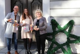 Ein Plätzchenausstecher in Form des Memminger Rathauses und ein Kochlöffel mit dem Memminger Mau sind rechtzeitig vor der Advents- und Weihnachtszeit in der Tourist Information erhältlich. Bürgermeisterin Margareta Böckh und Magnus Mayer, Herausgeber des Memminger Wimmelbuchs und Urheber der Grafikdateien für den Rathaus-Ausstecher und den Mau-Kochlöffel, erhielten aus den Händen von Kim Krattenmacher, stv. Leiterin der Tourist Information, die ersten Exemplare überreicht. „Sie sehen zauberhaft aus. Das ist eine ganz tolle Idee“, lobte die Bürgermeisterin, die gleich plante, gemeinsam mit ihren Enkelkindern ganz viele leckere Memminger Rathäuser zu backen.