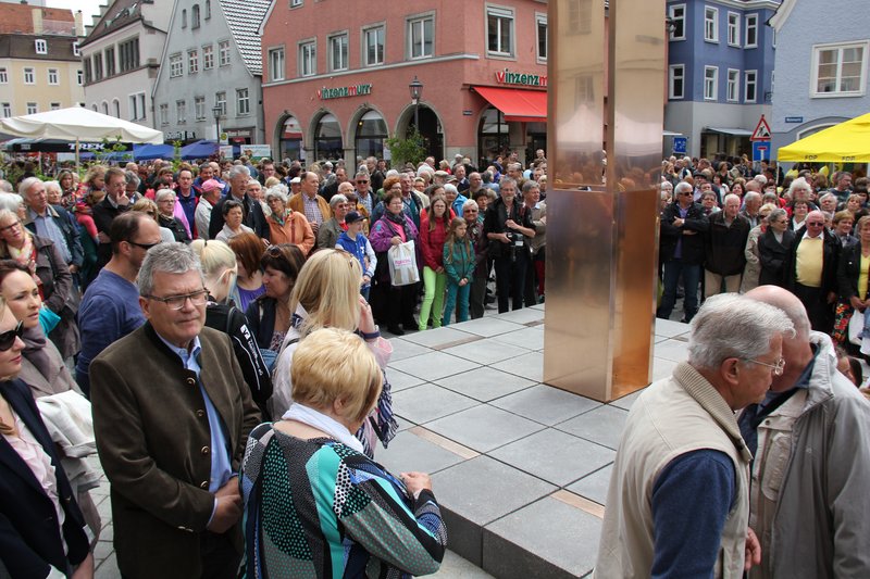Mit den Worten „Wasser marsch“ nahm Oberbürgermeister Dr. Ivo Holzinger den Brunnen offiziell in Betrieb. Doch wer jetzt mit fließendem Wasser gerechnet hat, wurde überrascht. Das „Brunnenkunstwerk“ hüllte sich in einen fast mystischen Wassernebel. Bei der Begrüßung der zahlreichen Ehrengäste und der Bürgerschaft hatte der Rathauschef zuvor die „Zwölf Artikel“ als die erste schriftliche Erwähnung von „Menschenrechten in Europa“ bezeichnet. „Das Wertvollste, das der Mensch haben kann, ist die Freiheit“, betonte Dr. Holzinger, gerade auch im Hinblick auf den schwelenden Konflikt in der Ukraine.
