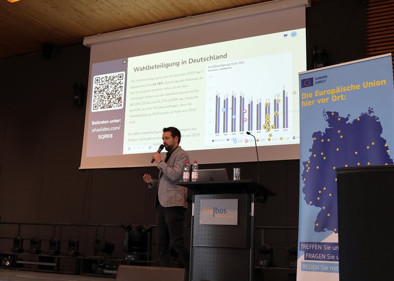 Zum Abschluss des Vortrags konnten die Schülerinnen und Schüler mit ihrem Smartphone ihr Wissen bei einem EU-Wahl-Quiz testen. Hierbei wurden Fragen zum Ablauf der Europawahl erläutert.