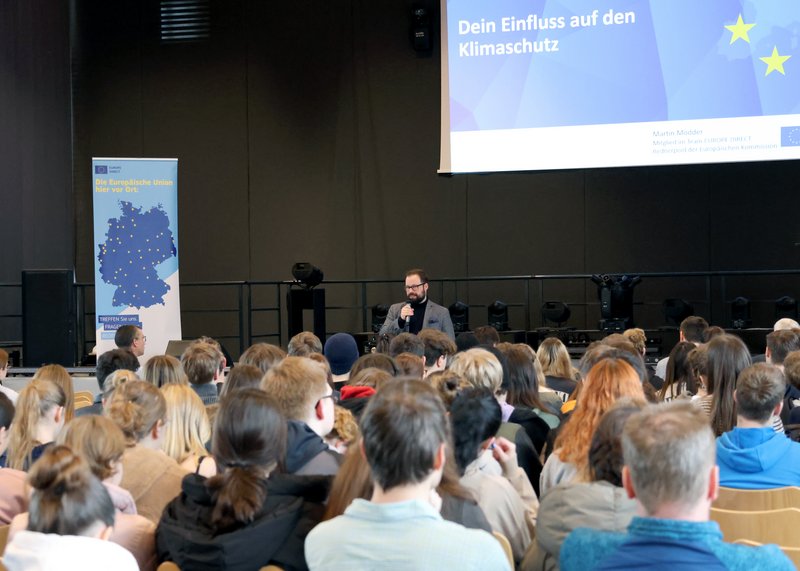 Das Thema Klimaschutz ruft bei jungen Menschen so viel politisches Interesse hervor wie wenige andere Themen. Auch die Europäische Kommission hat es mit dem Europäischen Green Deal zu einer ihrer höchsten Prioritäten gemacht. Aber warum ist das Thema eigentlich so relevant? Wie wird in der EU konkret auf den Klimawandel reagiert? Und welchen Einfluss haben junge Menschen auf die Klimaschutzmaßnahmen und die EU an sich? Mödder führte in seinem Vortrag aus, wo die EU aktuell beim Klimaschutz steht, wie politisches Engagement sich auf die bisherige Klimapolitik der EU ausgewirkt hat, wie junge Menschen selbst aktiv werden können und welchen Einfluss ihre Stimme bei der Europawahl auf die Klimapolitik der EU haben kann.