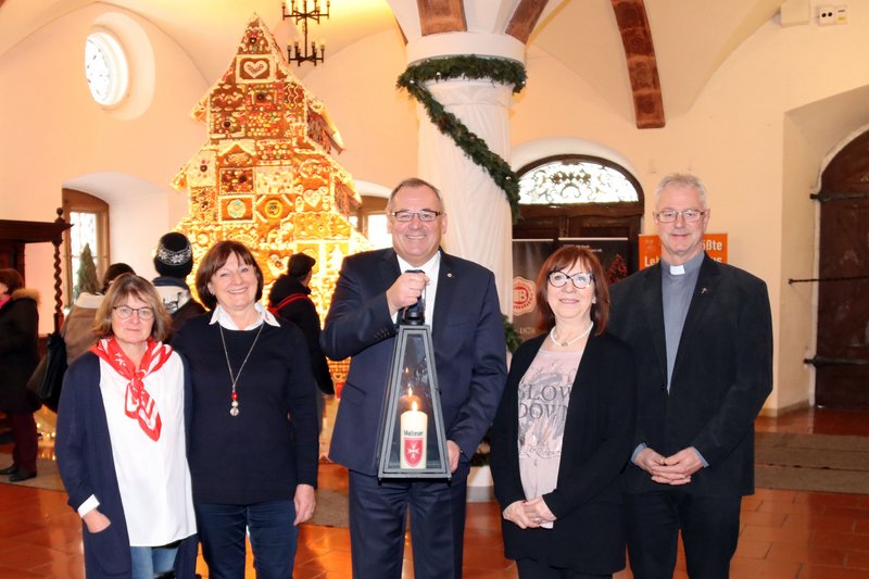 Das Licht von Bethlehem ist im Rathaus angekommen. Gertrud Brenner, Leiterin Soziale Dienste bei den Memminger Maltesern, überreichte eine Laterne mit einer brennenden Kerze an Oberbürgermeister Manfred Schilder. „Wir haben das Licht im Augsburger Dom abgeholt und nach Memmingen gebracht“, erzählte Gertrud Brenner. Das Kerzenlicht hatte bis zum Augsburger Dom bereits eine lange Reise hinter sich. In der Geburtsgrotte Jesu in Bethlehem entzündet, wird das Licht über ein eingespieltes Netzwerk in viele Länder verteilt. Dabei wird an die Weihnachtsbotschaft mit der Verheißung von Frieden erinnert: So wie sich das Licht der Kerze symbolisch verteilt, soll auch der Friede von Mensch zu Mensch weitergegeben werden.