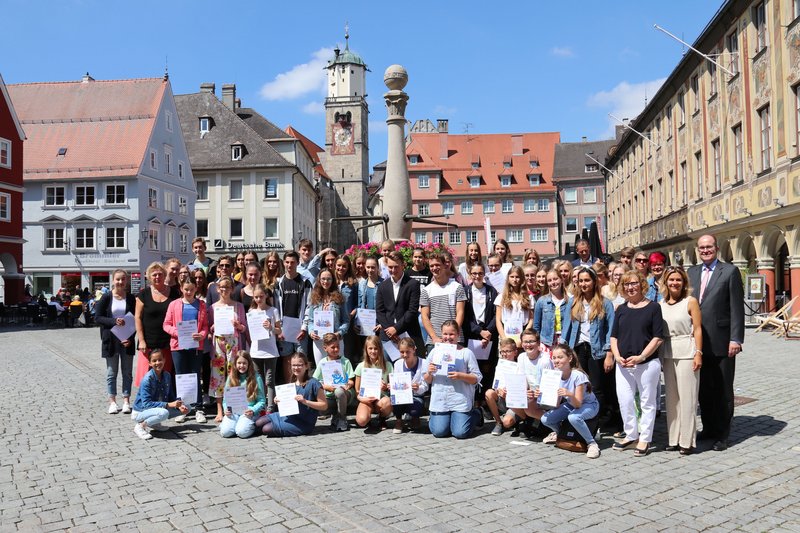 Anlässlich des 65. Europäischen Schulwettbewerbs freuten sich die Veranstalter, die Europa Union KV Memmingen sowie das städtische Europabüro, zahlreiche Siegerinnen und Sieger im Rahmen eines kleinen Festaktes im Memminger Rathaus zu ehren. Die feierliche Veranstaltung wird von der Sparkasse Memmingen-Lindau-Mindelheim großzügig unterstützt.