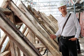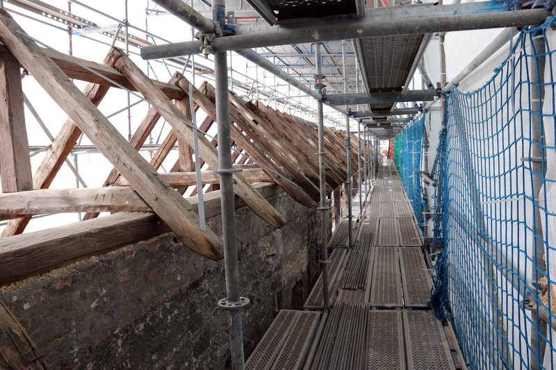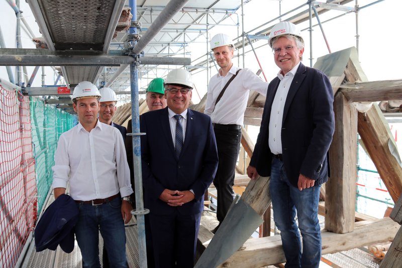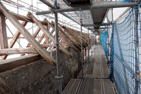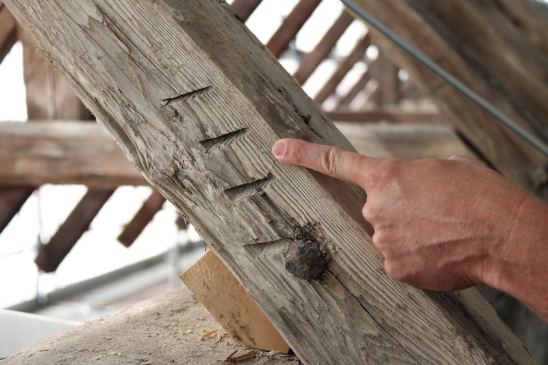 An der Überdachung aus dem 14. Jahrhundert lasse sich die spätmittelalterliche Bauweise hervorragend nachvollziehen, erläuterte Kayser. Es finden sich beispielsweise die im 14. Jahrhundert üblichen Zimmermannszeichen, etwa Einkerbungen ins Holz, um einen Balken zu kennzeichnen. „In Memmingen wird mit fundiertem Zimmermannshandwerk und restauratorischer Behutsamkeit saniert“, lobte Dr. Kayser. Herausgeschnitten werde altes Holz nur dort, wo es verfault sei oder von Pilz befallen. „Wir werden jedem einzelnen Balken gerecht“, erklärte Wolfgang Zettler, Geschäftsführer des beauftragten Bauunternehmens Zettler. „Das ist alte Zimmermannskunst, die unseren Mitarbeitern auch Spaß macht.“