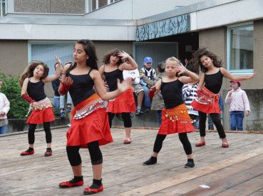 Als nachmittags das Wetter aufklarte wurden die, die bis dahin ausgeharrt hatten, mit einem Auftritt der Tanzschule Ciciler von Gülcan Sögüt belohnt. Im Bauchtanz-Outfit begeisterten die Kleinen mit ihren türkischen Volkstänzen.
