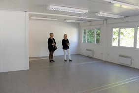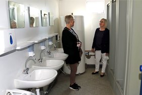 Seit wenigen Tagen stehen sechs Container vor der Eissporthalle am Hühnerberg. Bürgermeisterin Margaretha Böckh und Andrea Fischer, Leiterin Hallen und Veranstaltungsstätten, besichtigten die mobilen Kabinen, die in der kommenden Wintersaison knapp 100 m² zusätzlichen Raum zum Umkleiden und Duschen für die Vereine bieten sollen. „Mit den sechs Containern haben wir das zusätzliche Platzangebot, das bereits im vergangenen Jahr außerhalb der Halle geschaffen worden war, heuer um ein Vielfaches erhöht. Ich hoffe, dass damit der Wechsel der aufeinanderfolgenden Abteilungen leichter gelingt“, betont Bürgermeisterin Margareta Böckh bei dem Ortstermin. „Mit dem erweiterten Platzangebot gehen wir auf Nummer sicher, da die konkreten neuen Corona bedingten Regelungen im Rahmenkonzept Sport aktuell noch nicht bekannt sind“, ergänzt Andrea Fischer.