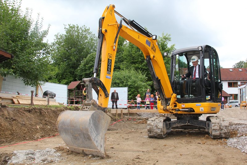 Die Buben und Mädchen waren sofort Feuer und Flamme als es darum ging, den „erwachsenen Ehrengästen“ beim traditionellen ersten Spatenstich in der Baugrube zu helfen. Danach trugen die Kinder dem Oberbürgermeister noch ein Gedicht vor, das sie mit einem lauten „Hurra“ beendeten. Den symbolischen ersten Spatenstich rundete ein Baggeraushub des Oberbürgermeisters ab, für welchen er reichlich Beifall und Zurufe der Kinder erhielt.