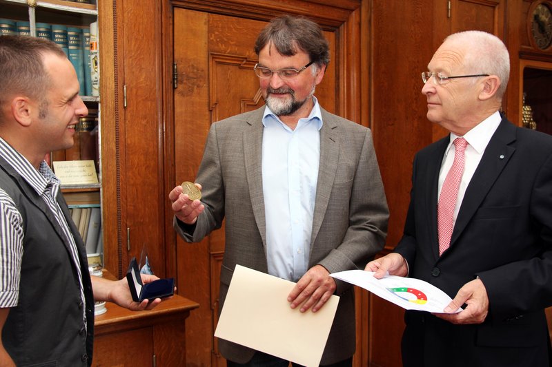Rudolf Schnug, Leiter des städtischen Garten- und Friedhofamts, beobachtet seit über 25 Jahren für den Deutschen Wetterdienst (DWD) die Entwicklungsphasen der Pflanzen wie Blattentfaltung, Blüte und Reife, wofür ihm Oberbürgermeister Dr. Ivo Holzinger jetzt im Auftrag des Bundesministers für Verkehr, Bau und Stadtentwicklung, Peter Ramsauer, die Wetterdienstplakette überreichte.