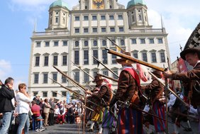 Ein großes Publikum zogen die Wallensteingruppen der Pikeniere und Musketiere bei ihren beeindruckenden Aufführungen und ihren Märschen durch die Innenstadt an. Von Trommeln, Flöten und den Kommandos ihrer Hauptmänner geführt, machten rund 125 Wallensteiner kräftig Werbung für die nächste Historische Wallensteinwoche im Jahr 2020. Ins Augsburger Rathaus zogen sie übrigens nicht ein, um die Regierung zu übernehmen, sondern nur um ihre Piken und Musketen sicher zu lagern.