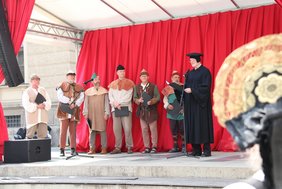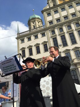Die Zwölf Artikel mit den Forderungen der Bauern aus der Reformationszeit nach Freiheit und grundlegenden Rechten verlasen Bauern-Darsteller unter der Leitung von Rolf Spitz auf einer Bühne im St.-Anna-Hof in Augsburg. An der Trommel unterstützt wurden sie von Dekan Christoph Schieder, der nach der Aufführung gemeinsam mit seinem katholischen Amtskollegen Dekan Ludwig Waldmüller als Straßenmusikerduo mit Trompeten durch die Augsburger Innenstadt zog. Dekan Schieder im hochgeschlossenen Lutherrock, Dekan Waldmüller in bodenlanger Soutane, gaben die beiden auch optisch ein beeindruckendes Bild. „Sind Sie echt?“, wurden die beiden immer wieder gefragt.