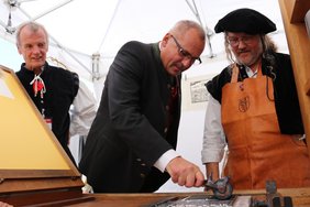 Am Stand der Stadt Memmingen konnten die Besucherinnen und Besucher an einer originalgetreu nachgebauten Gutenberg-Druckerpresse des Memminger MedienCentrums selbst drucken wie vor 500 Jahren. Unter der Anleitung der historisch gekleideten Drucker, Betriebsleiter Walter Kurz, Pius Haug sowie Claudia und Jürgen Birk trugen Interessierte Farbe auf eine Druckplatte und pressten die Farbe mit ganzer Kraft auf Papier. „Jetzt weiß ich, warum das drucken heißt“, kommentierte ein Junge. Gedruckt wurde ein Blatt mit zwei Artikeln der Zwölf Bauernartikel von 1525, das die Leute mit nach Hause nehmen konnten.