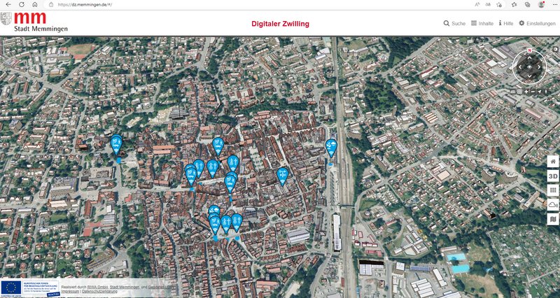 Über das öffentlich zugängliche Portal dz.memmingen.de können Bürgerinnen und Bürger beispielsweise Frequenzzählungen, Umwelt- und Wetterdaten abrufen. Auch virtuelle Rundflüge können erstellt oder Informationen über Gebäude herausgelesen werden.
