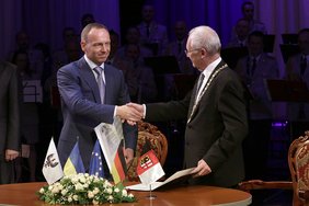 Höhepunkt des Aufenthaltes war der überaus beeindruckende Festabend, an dem die beiden Oberbürgermeister Vladislaw Atroschenko und Dr. Ivo Holzinger die Partnerschaft erneut schriftlich bestätigten. Beide Stadtoberhäupter betonten „das tiefe, gewachsene Miteinander“. Holzinger nannte dabei die unzähligen Aktivitäten, insbesondere der Bürger beider Städte. Er ging hier auf die vielseitigen Kontakte ein, die im Laufe der Jahre entstanden sind. Beispielhaft seien hier nur genannt die Bildungspartnerschaft, der Austausch mit den Ärzten sowie die vielen kulturellen Begegnungen mit Chören und Tanzgruppen.