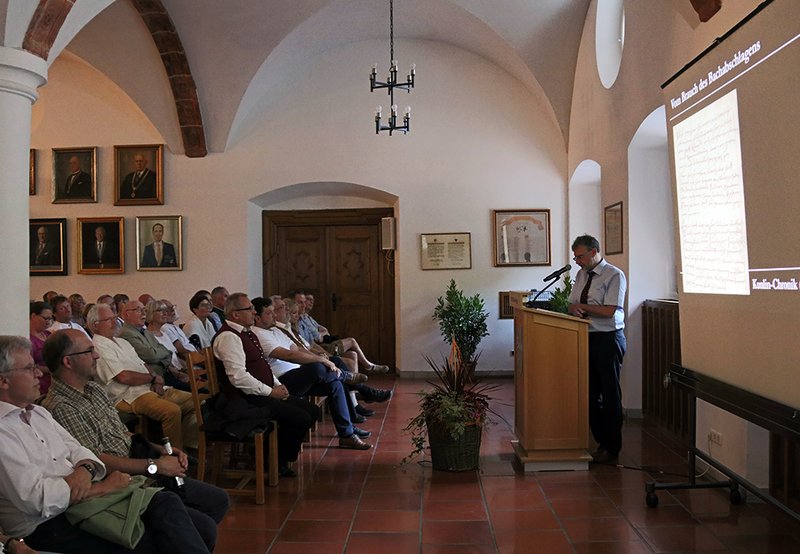 Stadtarchivar Christoph Engelhard nahm die Gäste nachfolgend auf eine Geschichtsreise zu den Ursprüngen und Grundlagen des Fischertages mit. Die Anlehnung an die Schöpfungsgeschichte gab dem Vortrag zum Thema „Vom Brauch des Bachabschlagens - Der Memminger Fischertag und seine Ursprünge in der Memminger Stadtgeschichte“ einen amüsanten Rahmen, der für Heiterkeit bei den Zuhörerinnen und Zuhörern sorgte. Nichts desto trotz vermittelte der Vortrag auch viel Wissenswertes rund um die Entstehung des Brauchtums des Fischertages, wie wir ihn heute kennen.