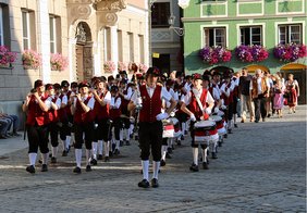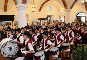 Begleitet von den Trommlerbuben hielten die 28 von 42 noch lebenden ehemaligen Fischerkönigen im Anschluss an das Konzert Einzug ins Rathaus. Laut hallte es durch die Halle „Schmotz, Schmotz, Dreck auf Dreck…“, als die Hoheiten und Gäste lautstark singend in den Marsch der Trommlerbuben einstimmten.