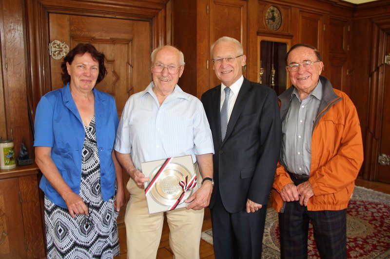Viele Jahre hat er sich um das Berghaus „Wäldele“ der Memminger Sektion des Deutschen Alpenvereins im Kleinwalsertal gekümmert, jetzt wurde Otto Pfeiffer von Oberbürgermeister Dr. Ivo Holzinger für seinen jahrzehntelangen Einsatz geehrt. Als „Urgestein des Memminger Alpenvereins“ begrüßte der Rathauschef den früheren Hüttenreferenten im Amtszimmer. Begleitet wurde dieser von der Vorsitzenden Gabriele Neun und dem Ehrenvorsitzenden Norbert Kloiber. „Für Ihr Engagement in rund 30 Jahren als Hüttenreferent und für die viele damit verbundene Arbeit möchte ich Ihnen im Namen der Stadt Memmingen und auch persönlich sehr herzlich danken“, betonte der Oberbürgermeister. Er überreichte ihm einen aufwändig gravierten Zinnteller für seine Verdienste um das Wäldele.
