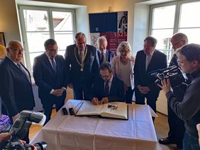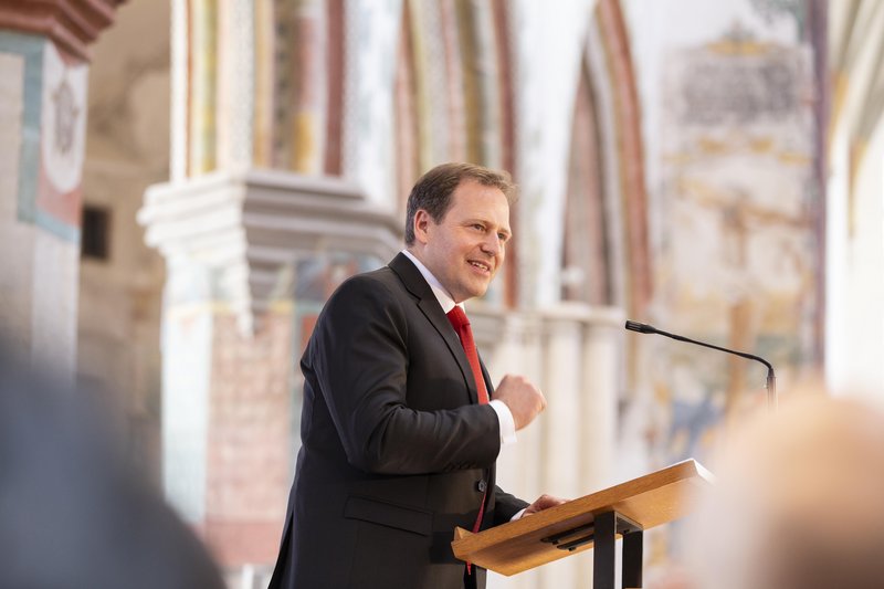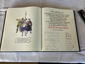 Mit Blick auf die 500-Jahr-Feier der Zwölf Artikel im Jahr 2025 plane die Stadt eine Stiftung zu gründen, informierte Oberbürgermeister Manfred Schilder. „Zweck der Stiftung soll es sein, erstens das Gedenken an die Abfassung der Zwölf Artikel zu pflegen und deren Bedeutung in die gegenwärtige Zeit zu übertragen, zweitens das Denkmal Kramerzunft zu erhalten und drittens die Teilhabe aller am Gemeinwesen zu fördern unter Wahrung unserer Verfassungs- und Freiheitsrechte“, erklärte Schilder. Der Oberbürgermeister lud die Bürgerinnen und Bürger der Stadt Memmingen und ihres Umlandes ein, an der Stiftung und ihrem nachhaltigen Wirken für Freiheit und Gerechtigkeit teilzuhaben. Einen ausdrücklichen Dank sprach Oberbürgermeister Schilder der Memminger Unternehmerfamilie Brey aus, die das Preisgeld für den Memminger Freiheitspreis gestiftet hat.