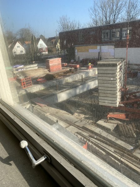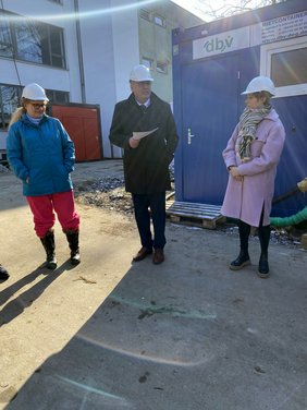 Beim Rundgang mit Oberbürgermeister Manfred Schilder, Rektorin Gila Barth und Konrektor Thomas Herz kann Architekt Markus Merz schon eine beeindruckende Liste an erledigten Aufgaben aufzählen. Die zwischen dem Schulgebäude und dem Hort gelegene Aula, der sogenannte gelbe Saal und der Mehrzweckraum des Horts, sind bereits Geschichte. Der Zwischenbau wurde komplett entfernt und die neuen Fundamente fertiggestellt. Hier wird auf einer größeren Grundfläche die neue Aula entstehen und nach dem Umbau die Küche zu finden sein. Architekt Markus Merz ist optimistisch, dass nach dem Rückbau und den Anbauarbeiten zum Herbst die sogenannte Baudichte hergestellt werden kann. Sprich der Baukörper mit neuen Fenstern und Türen versehen und nach den Arbeiten im Sommer der Bau wieder dicht ist.