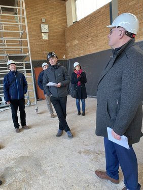 Im Zuge der Baumaßnahmen wird auch die Turnhalle saniert. Auch hier sind die Arbeiten schon weit gediehen. Es sollen wie beim Schulgebäude die Fenster ausgetauscht und die Außenhüllen und das Dach neu gedämmt werden. Weiterhin werden die Umkleideräume und WC-Anlagen erneuert sowie eine barrierefreie Umkleide mit WC eingebaut. Oberbürgermeister Manfred Schilder besichtigte die Gebäude mit großem Interesse. „Wichtig ist in diesem Zusammenhang zu erwähnen, dass bis jetzt keine unliebsamen Überraschungen zutage getreten sind. Und wir deshalb auch ganz im Zeitplan liegen“, freut sich das Stadtoberhaupt. Rektorin Gila Barth hatte nach dem Umzug der Schülerinnen und Schüler das alte Gebäude nicht mehr betreten, stand jedoch bei der Planung des Umbaus im engen Austausch mit dem städtischen Bauamt und den Architekten: „Wir haben uns sehr viele Gedanken gemacht; alle Räume, alle Zimmer geplant und ich denke, das wird wirklich toll!“