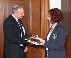 Dem Oberbürgermeister dankte er für die Übernahme der Schirmherrschaft und der Bürgermeisterin für den freundlichen Empfang im Rathaus. Bürgermeisterin Margareta Böckh wünschte der Veranstaltung einen guten Verlauf und viel Erfolg. Im Namen des Oberbürgermeisters überreichte sie dem Vorsitzenden des VdP Schwaben als Dankeschön für das Engagement das Buch des Landestheaters Schwaben "Verweile doch, du bist so schön" von Joséphine Weyers.