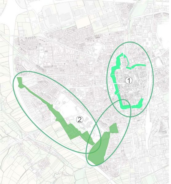 Außer diesem Bereich, könnte ein grüner Bogen geschlagen werden, von der Buxacher Straße über die Bodenseestraße, bis zum Stadtwald westlich der Römerstraße, über den Pulvermühlplatz, wo eventuell ein experimentelles Wohnviertel vorstellbar wäre und von dort zurück zum Wallgraben.