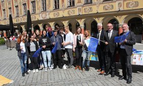 Sie alle zeigen Flagge für die EU: Die SchülerInnen des Vöhlin-Gymnasiums mit Lehrerin Anja Ströbel (rosa Blazer), die Leiterin des Europabüros, Alexandra Störl, Vöhlin Schulleiter und Vorsitzender der Europa Union, Burkhard Arnold, Oberbürgermeister Manfred Schilder und der Europäische Fahrradpräsident Manfred Neun. Foto: Madlener/Stadt Memmingen