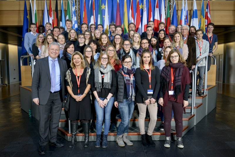 So kam die Gruppe gut vorbereitet in Straßburg an, wo der schwäbische Europaabgeordnete Markus Ferber die Gruppe in Empfang nahm. Nach dem gemeinsamen Foto vor den 28 Fahnen der Europäischen Union, nahm er sich viel Zeit für ein persönliches Gespräch. Ob zum Thema Euro, Freihandelsabkommen oder die Einführung der Maut, der Abgeordnete beantwortete alle Fragen ausführlich. Das Zusammenspiel der vielen Mitgliedstaaten in der EU verglich der Europa Politiker mit dem Bau eines Flugzeuges. „Baut einer nur Tragflächen und Rümpfe, führt dies zu keinem Ergebnis“. Jeder müsse seine Fertigkeiten einbringen, nur dann könne man ein gemeinsames großes Ganzes erstellen. Anschließend durften die jungen Besucher auf der Tribüne des Plenarsaals eine Debatte der Europaparlamentarier live miterleben. Zum Abschluss des Besuchs reichte die Zeit noch für den Besuch der Straßburger Innenstadt. “