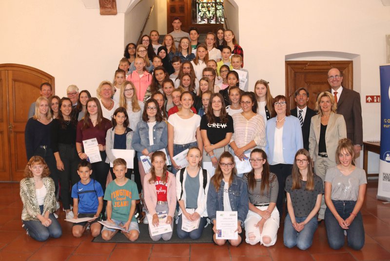 „Von der Vielfältigkeit und Professionalität eurer Arbeiten bin ich sehr beeindruckt“, lobte Bürgermeisterin Margareta Böckh die Bundes- und Landessiegerinnen und -sieger des 66. Europäischen Schulwettbewerbs bei einer Ehrung im Rathaus. Über 60 Schülerinnen und Schüler der Sebastian-Lotzer-Realschule, des Bernhard-Strigel-Gymnasiums und des Vöhlin-Gymnasiums wurden ausgezeichnet. „YOUrope – es geht um dich!“ lautete das Motto des diesjährigen Wettbewerbs. Die Rolle von Influencern im Internet wurde etwa in einem Videobeitrag von Schülerinnen des Vöhlin-Gymnasiums kritisch beleuchtet. Auf Plakaten gestalteten Schülerinnen und Schüler eine Kampagne für die Europawahl oder warnten eindringlich vor Umweltzerstörung wie der Vermüllung der Weltmeere mit Plastik.