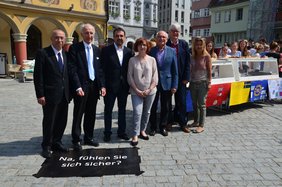 Sie alle nahmen an dem "Europäischen Gedankengang" teil: Mehmet Yildrim, Mitglied der Europa-Union KV Memmingen, der Vorsitzende Lajos Oszlari, MdL Klaus Holetschek, zweite Bürgermeisterin Margareta Böckh und dritter Bürgermeister Werner Häring, der Schulleiter des Vöhlin Gymnasiums und stv. Vorsitzende der Europa Union KV Memmingen, Burkhard Arnold, die Leiterin des städtischen Europabüros Alexandra Störl sowie die Schülerinnen und Schüler der Klasse 10w des Vöhlin-Gymnasiums. Foto: Schmid/Europa Union KV MM