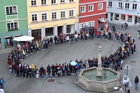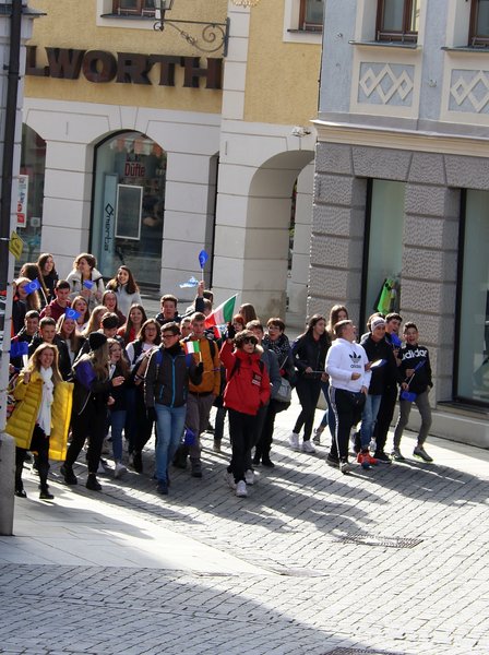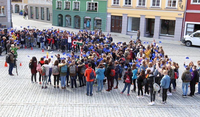 Der erste Programmpunkt für die internationalen Gäste war am Montagmorgen ein Sternmarsch auf den Marktplatz. Aus der Zangmeisterstraße, der Kalchstraße, der Fußgängerzone und vom Ulmer Tor her strömten die Jugendlichen zusammen. Auf ihrem Weg sangen die Italiener, Franzosen, Ungarn und Spanier ihre jeweilige Nationalhymne. Mit der Unterstützung einer Musikanlage wurde danach zur Europa-Hymne gewechselt, zu der die Mädchen und Jungen dann lebhaft die blau-gelben Europafähnchen schwangen. Über den Anblick freuten sich nicht nur die Memminger Passanten, sondern ganz besonders die Organisatoren wie Burkhard Arnold, der Vorsitzende der Europa Union Memmingen oder Alexandra Hartge vom Europa Büro. Im Anschluss an diesen Flashmob konnten die Schülerinnen und Schüler im Alter von 12 bis 17 Jahren an einer Stadtrally oder europäischen Stadtrundgängen teilnehmen.