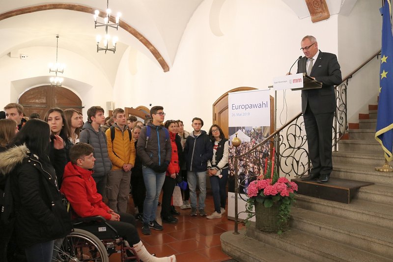 Oberbürgermeister Manfred Schilder begrüßte die Austauschteilnehmerinnen und -teilnehmer dann offiziell gegen Mittag im Rathaus. „Die Jugend ist verantwortlich dafür, dass es in Europa vorwärtsgeht“, so das Stadtoberhaupt. Deshalb freue es ihn sehr, dass so viele Schülerinnen und Schüler bei dieser Austauschmaßnahme dabei seien. Schilder lobte auch das Engagement der betreuenden Lehrerinnen und Lehrer, die vom Rupert-Ness-, Bernhard-Strigel- und Vöhlin-Gymnasium dieses Jugendtreffen begleiteten. Er dankte der Sparkasse Memmingen-Lindau-Mindelheim, die das Jugendtreffen mit einem Sponsoring-Beitrag unterstützte, und bei allen, die diesen lebendigen Austausch möglich machten.