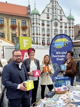 Engagiert für Fairtrade am Memminger Wochenmarkt (v.l.): Oberbürgermeister Jan Rothenbacher, Petra Beer, Sprecherin der Steuerungsgruppe Fairtrade, Alexandra Hartge, Leiterin der Stabsstelle Stadtmarketing, und Britta Manici, Stabsstelle Stadtmarketing. (Foto: A. Wehr/ Pressestelle Stadt Memmingen)