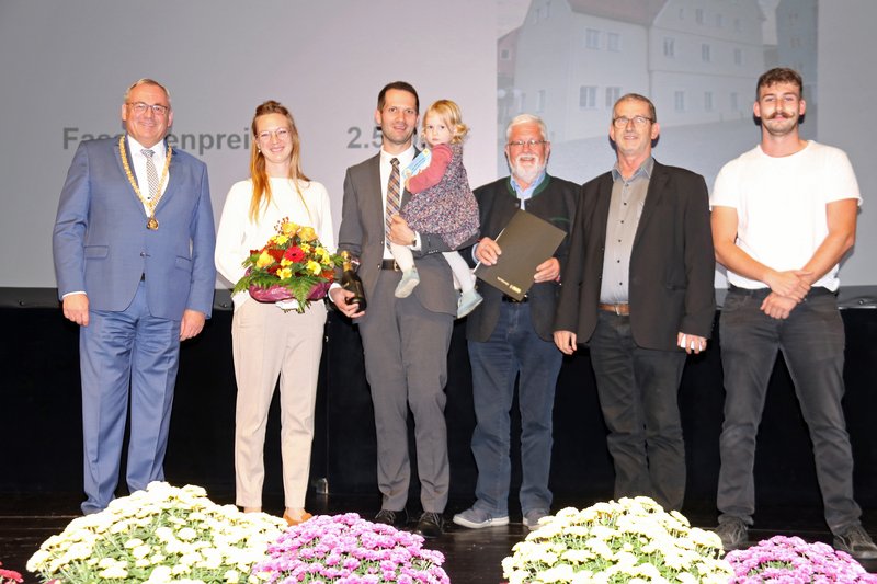 In der Plenumssitzung des Stadtrats verlieh Oberbürgermeister Manfred Schilder den Fassadenpreis der Stadt Memmingen 2022 für zwei herausragende Sanierungsprojekte in der Innenstadt. Er zeichnete Familie Bader als Bauherr für die vorbildlich gelungene denkmalgerechte Sanierung des Küchlinhauses in der Zwinggasse 2 aus und Bauherrn Christian Reinwald für die vorbildlich gelungene Gesamtsanierung der ehemaligen Einhornapotheke in der Kramerstraße 33. „Wir freuen uns sehr über die äußerst gelungenen Sanierungen und gratulieren den Bauherren sehr herzlich! Mit dem Fassadenpreis ehrt die Stadt Memmingen diejenigen, die mehr als notwendig in die Gestaltung und Verbesserung des Ortsbilds investieren“, erklärte Oberbürgermeister Schilder. Der Fassadenpreis ist mit jeweils 2.500 Euro dotiert und wird einmal im Jahr verliehen.