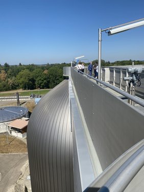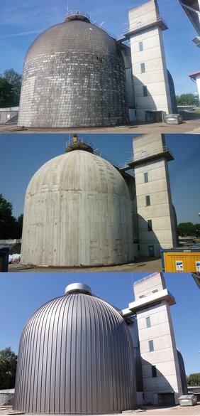 Nach umfassenden Vorbereitungsarbeiten wurde von einer Spezialfirma die neue Außenverkleidung aus 22 Meter langen, an die Behälterform angepassten Recycling-Aluminiumblechen angebracht. „Es war eine große Herausforderung, die langen Bleche an den Faulbehältern zu montieren. Doch die Mühen haben sich gelohnt – jetzt erstrahlen die Faulbehälter in neuem Glanz und dank des recyclingfähigen Aluminiums ist die Hülle nicht nur nachhaltig, sondern auch über 50 Jahre haltbar“, erklärte Dietmar Hörberg, Leiter Abfallwirtschaft und Abwasser, stolz.
