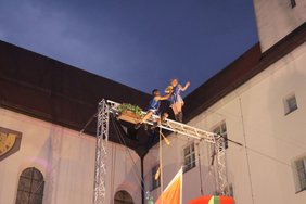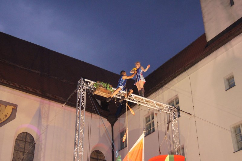 Zum krönenden Abschluss der Festivaleröffnung 2018 präsentierte das Artistik-Duo "Circus UnARTiq" mit Lisa Rinne und Andreas Bartl eine atemberaubende Trapeznummer im Karree zwischen Kreuzherrnkloster und Hallhof. Poetische Momente wechselten sich mit schwindelerregender Akrobatik ab und gipfelten in der schwingenden Trapeznummer von Lisa Rinne. Der lange Applaus des Publikums galt den Akrobaten und der gelungenen Eröffnung des Memminger Kultursommers.