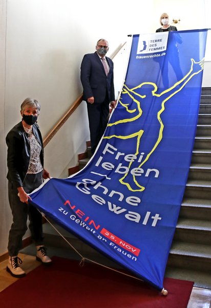 Die neue Fahne, mit der Terre des Femmes unter dem Motto ‚Blauer, Lauter, Sichtbarer!‘ der Botschaft „frei leben – ohne Gewalt“ einen neuen Anstrich verleihen möchte, wird in Memmingen am Rathaus gehisst.