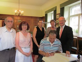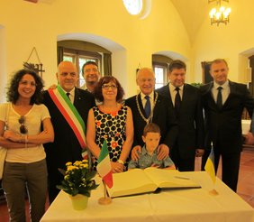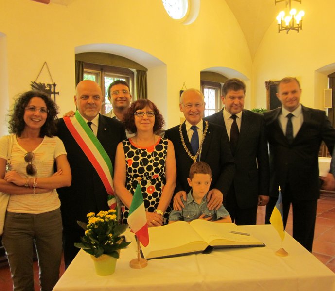 Holzinger empfing die Gäste traditionell im Rathaus zum Eintrag ins Goldene Buch. Im Rahmen des Empfangs betonte Bürgermeister Maurizio Brucchi aus Teramo die langjährige Verbundenheit und tiefe Freundschaft zwischen den Städten. Zweiter Bürgermeister Oleg Sheremet aus Tschernigiv sagte: „Wir fühlen uns in Memmingen schon wie zu Hause“. Beide waren sich einig, daß sie zwischenzeitlich beim Bummel durch die Stadt „immer wieder Freunde und Bekannte treffen“. Der Rathauschef begrüßte die Gäste sehr herzlich. Holzinger freute sich „die Festtage auch mit unseren Freunden aus den Partnerstädten erleben zu können“.