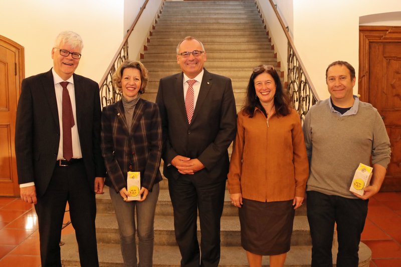 Zur Erinnerung an den Aufenthalt in der Maustadt überreichte der Oberbürgermeister den Schülerinnen und Schülern Pins mit dem Stadtwappen und Memmingen-Taschen. Für die französischen Lehrkräfte Emérique Guernot und Laurent Dubreuil gab es als Willkommensgeschenk einen "Memminger Mau" mit Pralinen.