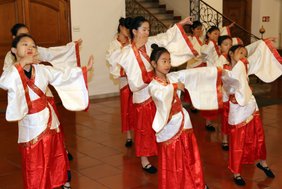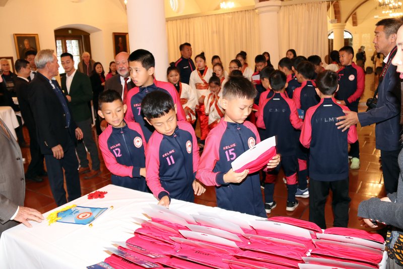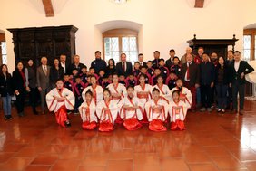 Die jungen Tänzerinnen brachten mit einem meditativen Tanz in traditioneller Kleidung einen Hauch des alten China mit ins Rathaus. Bürgermeister Dr. Steiger dankte ihnen für ihre anmutige Darbietung. Von den jungen Fußballern hoffe er bei der Fußball-Weltmeisterschaft 2030 in China den einen oder anderen auf dem grünen Rasen der chinesischen Fußballstadien wieder zu sehen, erklärte der Bürgermeister den jungen Sportlern. Gemeinsam mit Vertreterinnen und Vertretern chinesischer Schulamtsbezirke, mit Lehrerinnen, Lehrern und Trainern reisten die über 35 jungen Leute nach Memmingen. Die jüngste Teilnehmerin ist erst acht Jahre alt. Organisiert wird der Austausch auch vom Deutsch-Chinesischen Kulturverein Aschaffenburg, deren Vorsitzende Yucai Qui und Stellvertreter Karl-Heinz Stegmann mit nach Memmingen gekommen sind.
