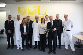 Bei der Begrüßung der Gastärzte aus Tschernihiw im Klinikum: Der stv. Referatsleiter Roger Kolb, Oberarzt Dr. Heinz Krautwurst, die Beauftragte für Städtepartnerschaften Alexandra Störl, Chirurg Jurii Syliaiev, der stv. ärztliche Direktor Dr. Walter Hofmann, die Gynäkologin Jevhenia Petukhova, der Gefäßchirurg Viacheslav Rybachuk, Vitalii Shunkarov (Endoskopie) und Prof. Dr. Christian Schinkel. Foto: Elke Schopf/Klinikum Memmingen.