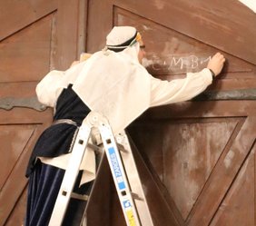 Schilder bedankte sich bei den Gemeindereferentinnen, insbesondere bei Angela Föhr, für die Koordinierung der diesjährigen Aktion. Stellvertretend für alle Memminger Sternsinger nahm Fabian Metzger die Spende der Stadt entgegen. Vom Gesang der Mädchen und Buben begleitet wurde der traditionelle Segensspruch 20*C+M+B*18 an das große Rathaustor angeschrieben. Die drei Buchstaben stehen für die lateinischen Worte „Christus mansionem benedicat“ – Christus segne dieses aus.