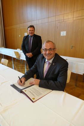 Oberbürgermeister Stefan Bosse und Oberbürgermeister Manfred Schilder schafften mit ihren Unterschriften unter dem Kooperationsvertrag die rechtliche Grundlage für die Zusammenarbeit.
